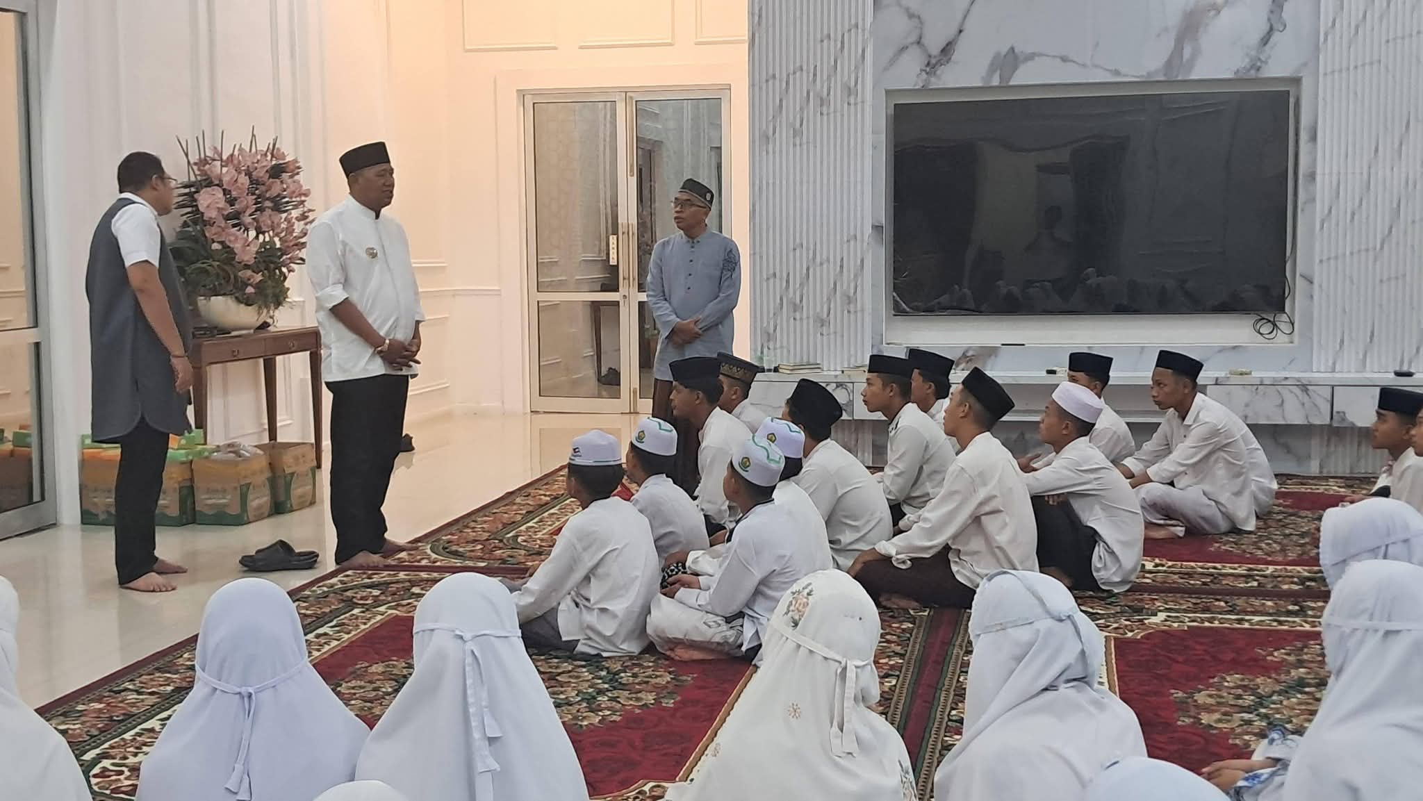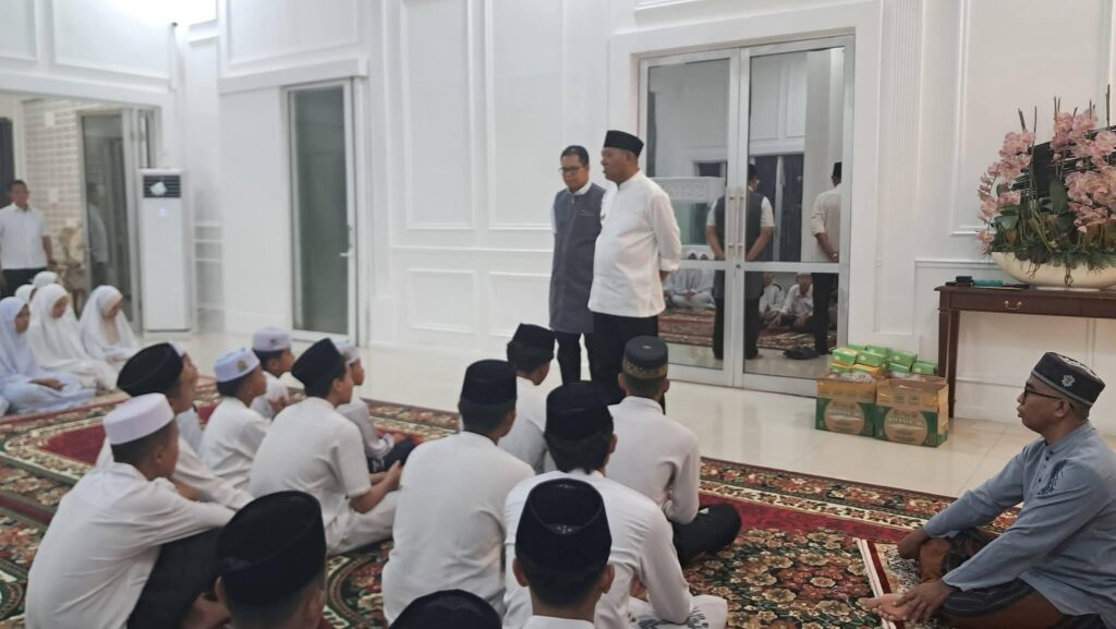 Stabat – H. Syah Afandin menyambut kunjungan 100 santri dari Pondok Pesantren Ulumul Quran di Rumah Dinas Bupati Langkat, Rabu (25/2/2026). Kegiatan tersebut dirangkaikan dengan pelaksanaan sholat Isya dan Tarawih berjamaah, sebagai bagian dari tradisi keagamaan yang rutin dilaksanakan setiap bulan suci Ramadhan.
