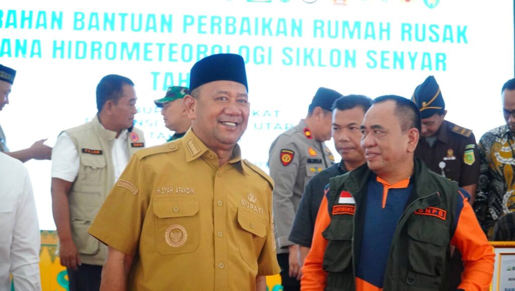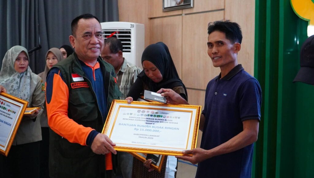 Stabat, Langkat – Syah Afandin, SH menyalurkan Bantuan Stimulan Perbaikan Rumah Rusak Ringan dan Sedang Tahap II Tahun 2026 bagi masyarakat terdampak bencana hidrometeorologi Siklon Senyar di Kabupaten Langkat. Penyerahan bantuan berlangsung di Jentera Malay Rumah Dinas Bupati Langkat, Selasa (3/3/2026), sebagai bagian dari komitmen pemerintah pusat dan daerah dalam mempercepat pemulihan pascabencana.