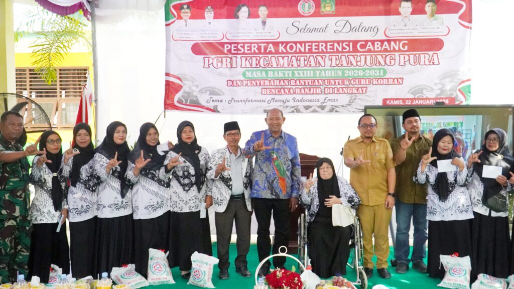 Langkat – Bupati Langkat H. Syah Afandin, SH menyalurkan bantuan sosial bagi Guru dan Tenaga Kependidikan (GTK) yang terdampak banjir di Kecamatan Tanjung Pura, sekaligus membuka secara resmi Konferensi Cabang Persatuan Guru Republik Indonesia (PGRI) Kecamatan Tanjung Pura masa bakti XXIII Tahun 2026–2031. Kegiatan tersebut berlangsung di SD Negeri 050727 (SD Negeri 4) Tanjung Pura, Kamis (22/1/2026).