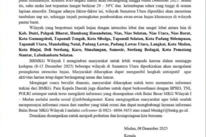 Langkat – Badan Meteorologi, Klimatologi, dan Geofisika (BMKG) Balai Besar Wilayah I Medan mengeluarkan peringatan kewaspadaan dini terhadap potensi cuaca ekstrem yang diprakirakan berlangsung pada 8 ...