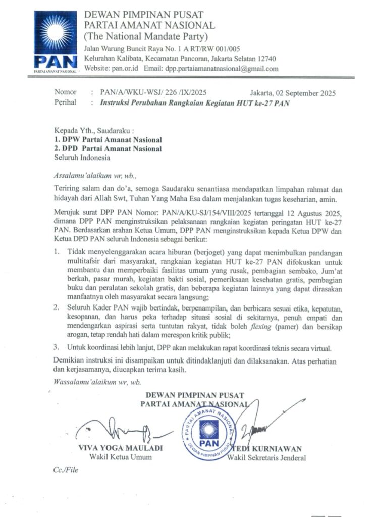 Dalam surat resmi bernomor PAN/A/WKU-WSJ/226/IX/225 bertanggal September 2025 dan ditandatangani oleh jajaran pengurus DPP PAN, terdapat beberapa poin penting, di antaranya: