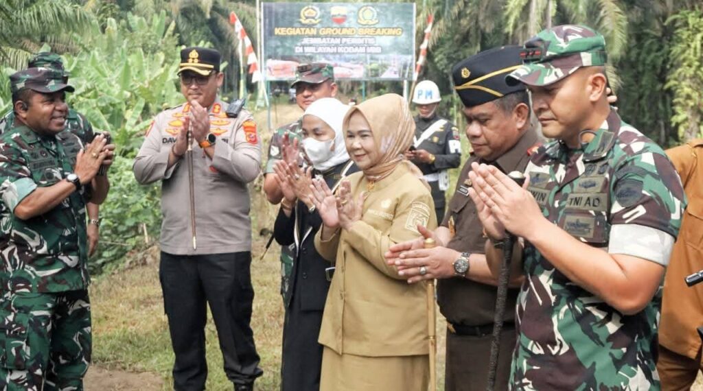 Kuala,Langkat – Sinergi antara TNI dan Pemerintah Kabupaten Langkat kembali menunjukkan hasil nyata bagi masyarakat. Mewakili Bupati Langkat H. Syah Afandin, SH, Wakil Bupati Langkat Tiorita Br Surbakti, SH menghadiri seremoni ground breaking pembangunan Jembatan Gantung Garuda Merah Putih di Kelurahan Bela Rakyat, Kecamatan Kuala, Senin (6/4/2026).